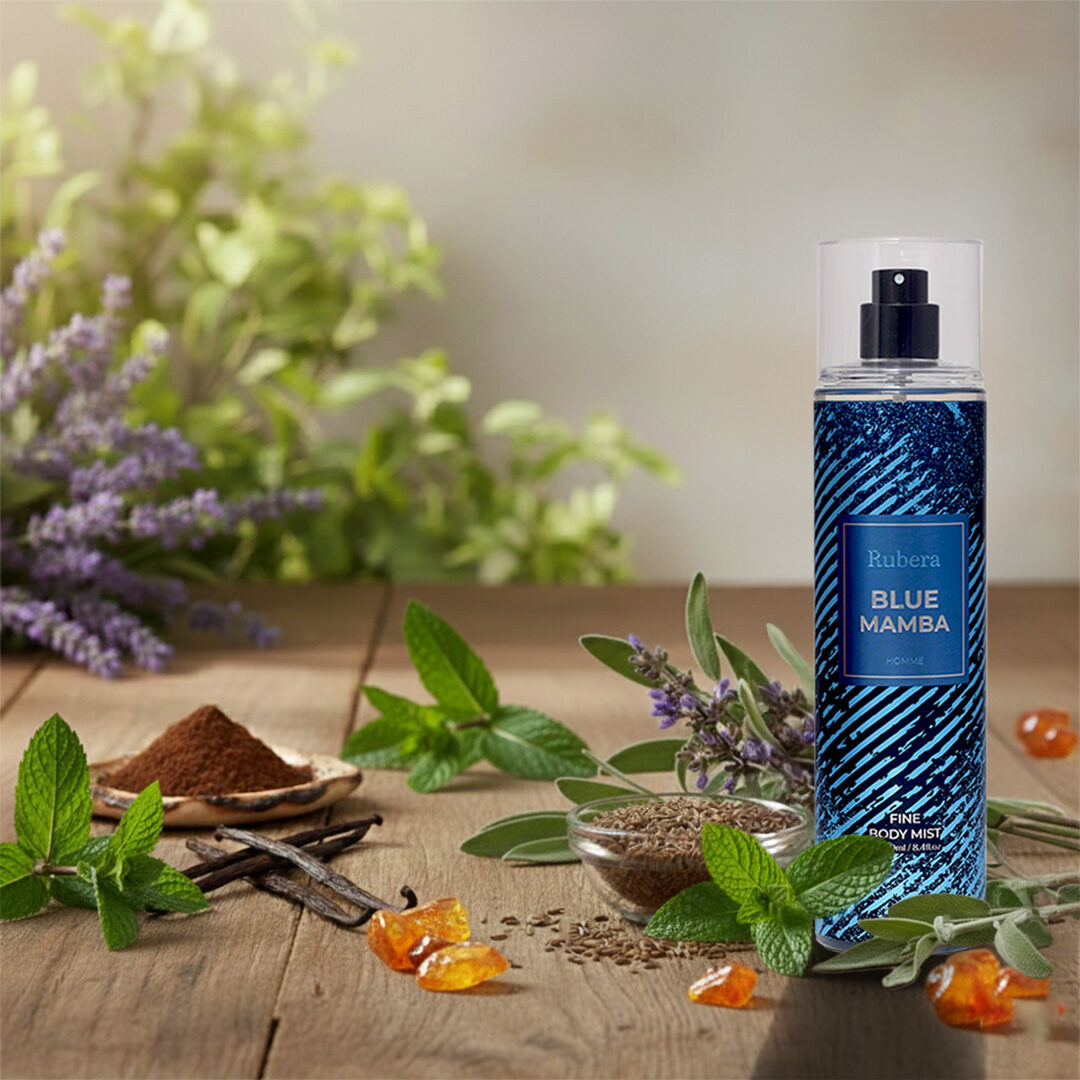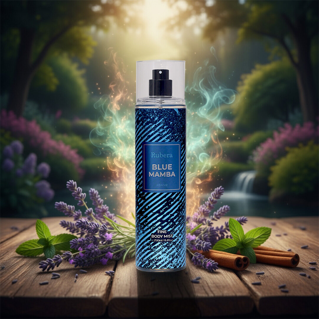 Blue Mamba opens with refreshing notes of pear, lavender, mint, bergamot, and lemon. The heart features cinnamon, clary sage, and caraway, layered over a rich base of black vanilla husk, amber, patchouli, and cedar.