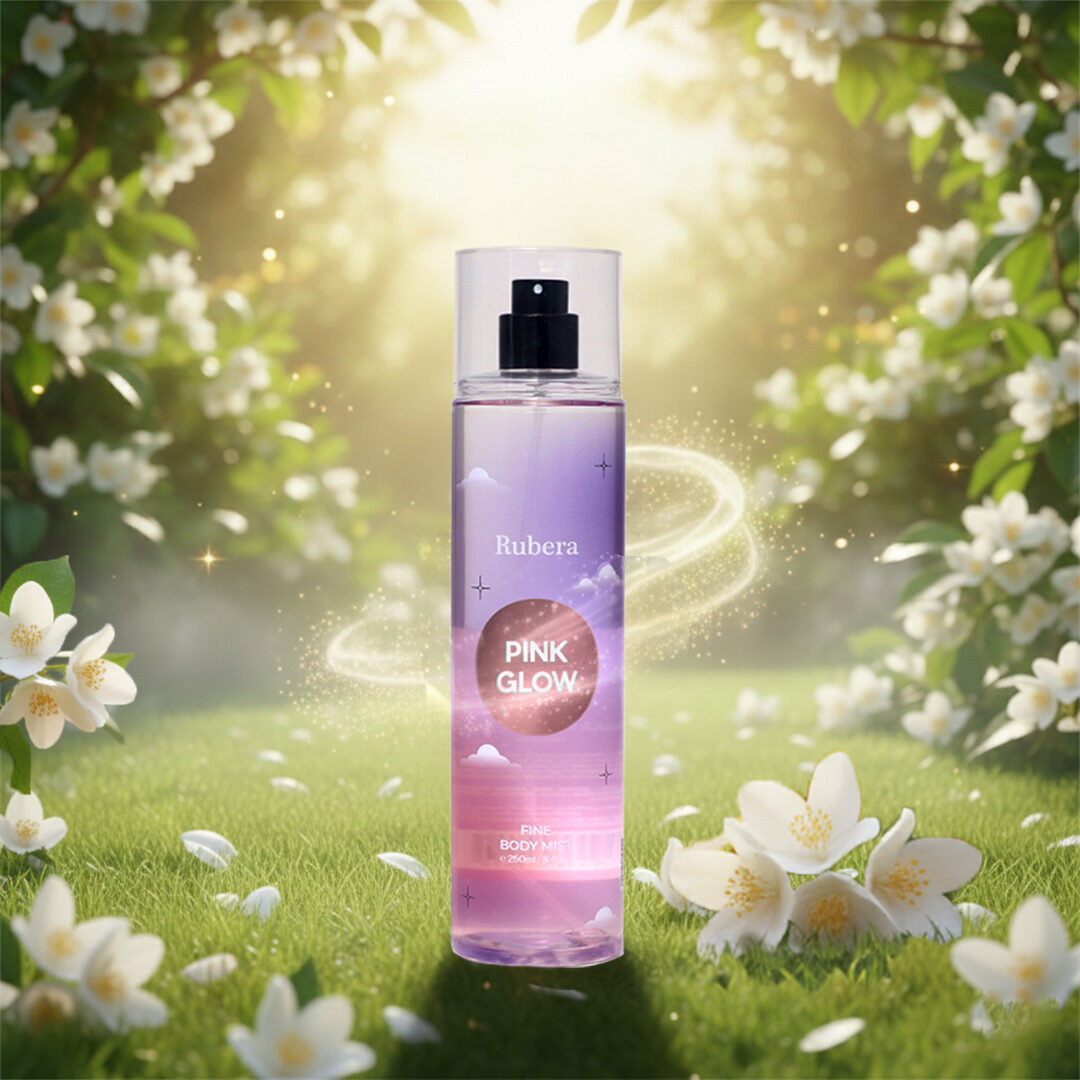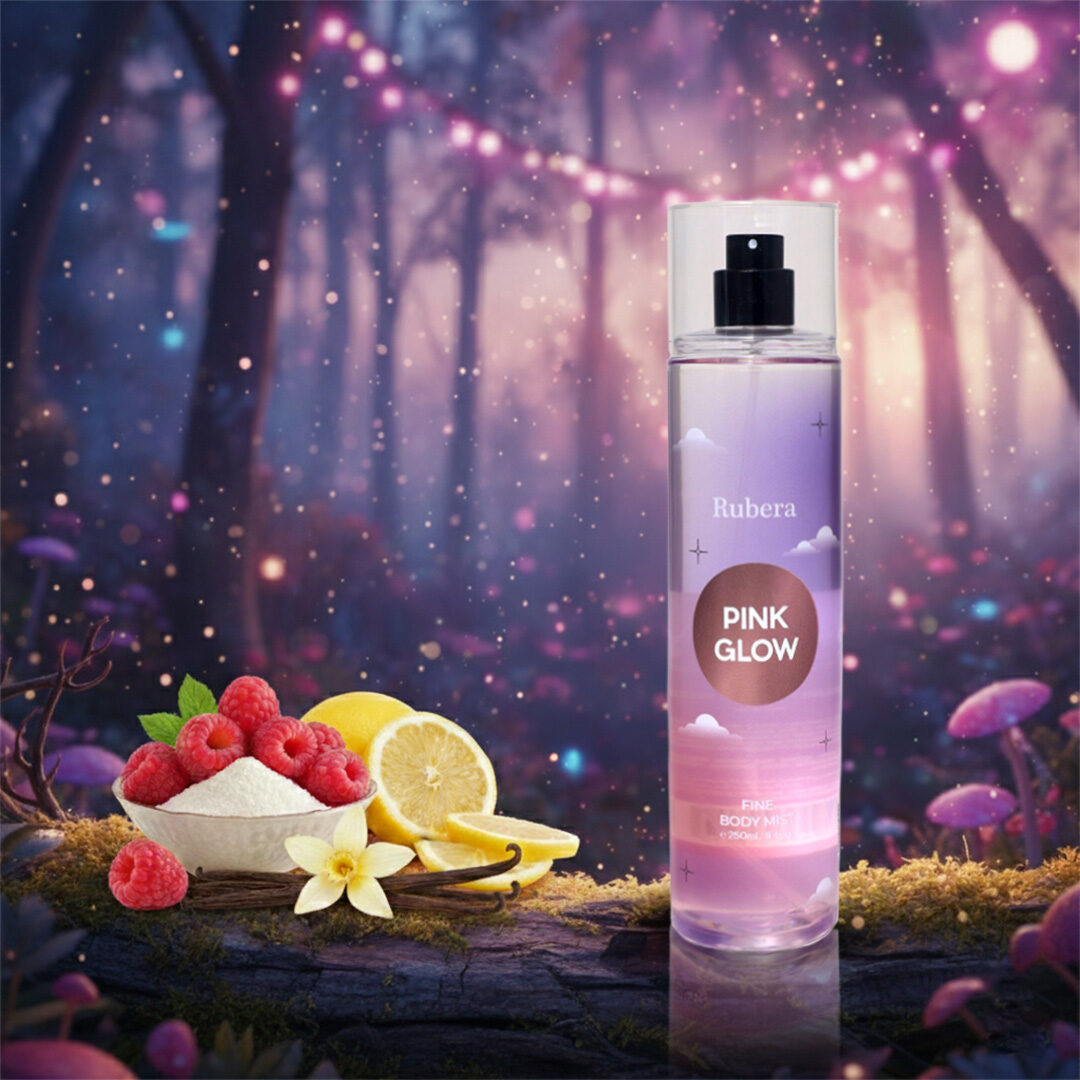 Pink Glow shines with lemon and fresh accords on top, leading into a romantic heart of rose, raspberry, peach, and jasmine. The scent rests on musk, vanilla, and sandalwood, creating a soft and charming aura.