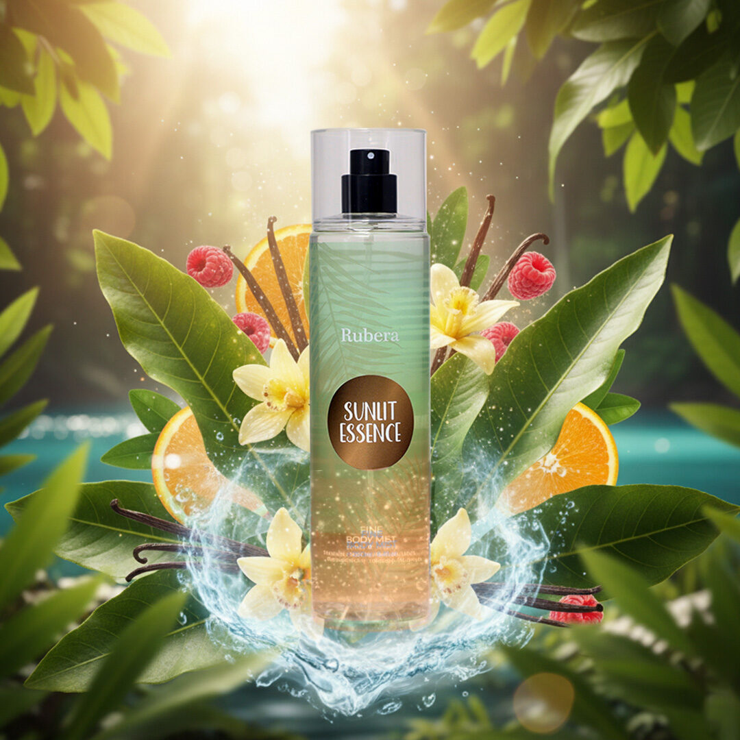 Sunlit Essence sparkles with lemon, orange, and fresh citrus notes. The heart combines apple, raspberry, pineapple, and aquatic accords, while vanilla, patchouly, and ambery tones add depth and warmth.